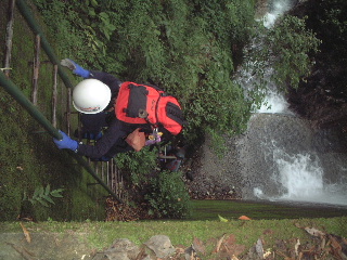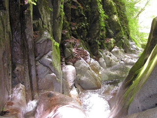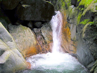 両脇が岩に囲まれたゴルジュ(岩壁に挟まれた谷の部分いっぱいに水が流れているものをいう)はザブザブと歩いていく。水の中を自然に歩いていくという事自体子供に返ったような楽しさだった。高捲きで斉木さんがザイルを片づけている間、夫が間違えて急流のゴルジュに下りそうになったり、どうにも岩をよじ登れなくて、お尻を押してもらったり・・・。私にしても、どうにも登れなくて、差し出してくれた手やザイルにすっかり頼ってしまったり・・と、手のかかる私達であった。しかし気がつけば、ちょっとした所では私達もいつしかそれなりの知恵をつけ、気がつけばリーダーは安心して?先へと行ってしまっていた。それでも「駄目だと思ったらドボンして下さい」と滝への落ち方を指導され、難所では必ず確保してくれていたのだ。治りかけた足の捻挫を又こじらせたくは無かったし寒かったから、ドボンは今回遠慮したが、暑くなって再び行く機会があったら是非体験してみよう