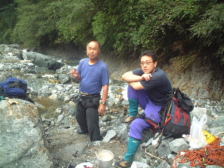 広い川原に出るとそこは玄倉川本流へと注ぐ合流点だった。そこで身支度を整え、遡行図をのぞく。経験のない私には読んでもピンと来なかったのだが、この先も時々その遡行図を見ながら、丁寧にいろいろと教えて貰えた。沢用語もいくつかようやく理解できた。やはり百聞は一見に如かずである。