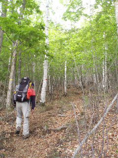 | 小川山は樹林で見通しの悪い登山道が続きますが、最初は白樺林。まだ若い葉が輝いています。 | ||||
