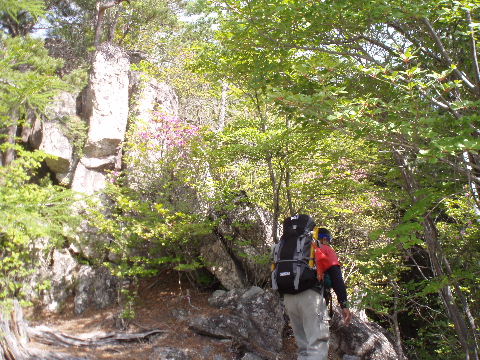 | そして屋根岩への分岐です。近くではRCの練習をしているファミリーがいましたが、この先の屋根岩がゲレンデなのでしょうか?行ったことないので分かりませんが、このあとクライミング装備の人たちと結構すれ違いました。既に午後4時を過ぎていますが、これから練習だそうで、落ちても安全なように大きなマットをそれぞれに背負っていました。 登山道はかなりショートカットされてます(上記のルートトラック参照)。辺りはレンゲツツジが丁度見頃できれいでした。 |