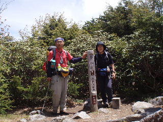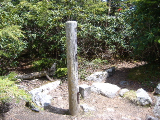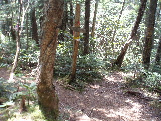 山頂標柱の右向こうに延びているのが同ルートの下山路ですが、 以前登った時うっかり左(倒木のある方)に行ってしまい、 迷子になってしまったのでした。 人がいて道をふさいだ形になっていたものか、 左の道が目に入って疑いも無く行ってしまったのです。 その時は登り返して再びこの山頂に戻り 改めて下山し直しています。 まったくドジなことでした(^^ゞ |