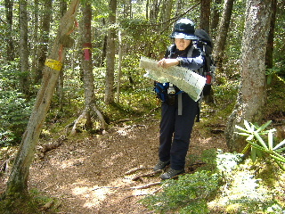 今回は迷わず下山^_^; 地図を広げていますが八丁平へ廻ろうかどうか 考えています。 山頂でゆっくりしてしまいましたし、 時間がかかりそうなので 同ルートへ。 |