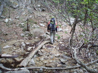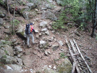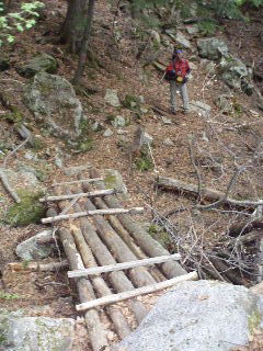 人の手で立てかけられた木の枝を頼りに。 ここは後ろ向きで下っています。 |