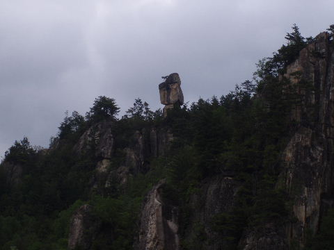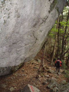 そして、その左上の岩。 こけしのような頭でっかちな岩・・・ よくのっかってますよ〜〜 くっついているのかな? 地震があったらポキン、ゴロ〜ンな感じかなと ここでも地震の恐怖を思います。 あそこも練習する場所なんでしょうか? ↓ |
