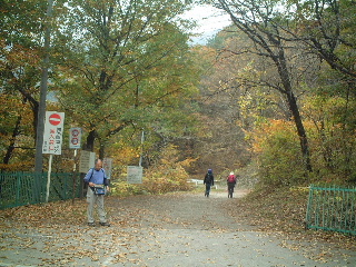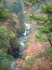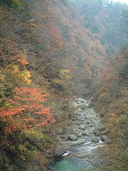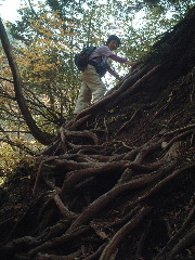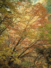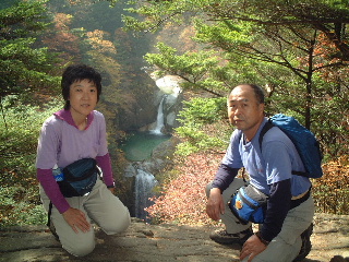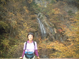 天気;晴のち雨 Member.夫婦 【神蛇滝(じんじゃたき)で】右 駐車場9:40〜竹宇駒ヶ岳神社9:45-50〜千ヶ淵10:00〜百合ヶ渕10:57〜神蛇滝11:10-37〜不動滝12:10-35〜林道分岐〜錦滝12:55-13:15〜林道分岐13:23〜不動滝13:45〜(合羽着用)〜下山路分岐14:15〜(カメラ紛失に気づき引き返す14:35〜カメラ見つかる15:00)〜駐車場15:20 八ヶ岳を歩いた後は、久しぶりにのんびりとキャンプするのが今回の目的のひとつだった。それでも目前に黒戸尾根、甲斐駒登山口となると、途中まででもムズムズと登りたい気持ちがわき上がってくる。気持ちを察した夫が「行って来いよ」と言ってくれるが(一緒に行くとは言わない)、コースタイムを見ると日が短くなった今、やはり一日では厳しい。その上天気は下り坂の筈だったので、あっさり諦めた。 キャンプの朝はゆっくり起床。天気はまだ大丈夫!朝食メニューはおうどんと、キムチ入りの野菜炒め。昨夜の残り物だ。コーヒーor紅茶を飲んで、昨夜同様のんびりタイム。その後は片づけを済ませ、車を駐車場に移してからそれぞれナップザックを背負って、尾白川渓谷散策に向かった。 散策に向かう人は多かった。皆似たような軽いハイキングスタイルだ。駐車場から数分歩くと駒ヶ岳神社があり、そこでお詣りしてから吊り橋を渡った。黒戸尾根への分岐から渓谷への道を辿る。周囲の黄葉に目がいくが、時期的には少し遅かったようだ。それでも渓谷の美しさを充分味わえた。 まず千ヶ淵から始まって、旭滝。この旭滝は下に下りないと見えないが、下り口に気付かない人も多いかもしれない。ただ一人旭滝に向き合うと、滝音だけに包み込まれる静寂さがむしろ恐怖に感じる。 元に戻り、また歩き始めるが、渓谷の軽い散策というより、しっかりした山歩きだと思った。ひと山登っているような感じだ。それでも20分か30分歩けば見事な滝や淵、川の流れが現れ、終わりかかってはいるが絶えず紅葉・黄葉が目を楽しませてくれる。もう10日ほど早い時期に歩きたかったと思ったが、その頃はかなりの人出だったに違いない。しっかりした鉄梯子が随所に取り付けられ、観光地と頷ける。それでも滑落事故などたまに起こるそうだから要注意だ。 木の根を階段のようにした登山道をいくのは痛々しくて、木に申し訳ない思いがした。それでも掴まりながら安心して登れるのは有り難いという矛盾・・。そこを通過すると少し広くなり、数名休憩していた。 そこは「神蛇滝(じんじゃたき)」。「わぁ!素晴らしい!」と思わず声が出た。西沢渓谷の七ッ釜五段ノ滝や、小川谷を思い出す。私達もそこで一休みし、しばしその景観を味わった。ここから下山路に向かう人も多い。そこで下山しても既に中央道の渋滞に入りそうだったので、地図を見ながら不動滝か錦滝まで行こうかということになった。近くの若いカップルも不動滝か錦滝までと考えていたようだった。 不動滝まで向かう人も戻ってくる人も数グループいた。戻ってくる人のほとんどが若い人で、何も持たない人が多かった。夫が「もし何かあったらどうするつもりだろうね?」と言いながら「そうか、若いからみんな助けてくれるか・・。おまえはしっかり持たなきゃ!」と、私に嬉しそうにのたまう。「うん!私に姨捨山はあり得ないわ!絶対帰ってやるぅ・・・♪」と逆襲(^o^) 長い吊り橋が眼下に見えてくると、そこは不動滝だった。眺めるには吊り橋の手前からの方が良いようだ。 私達は近くまで行き、そこから錦滝へと向かった。ほとんどの人がここまでらしく、登山道は一気に荒れたような感じになった。しかしルートは比較的しっかりしている。あとから気付いたことであるが、不動滝から錦滝はスズメバチの巣があり、危険なため通行止めだったそうだ(白州町の秋の観光情報より)。しかし登山道にそうした注意書きや標識などは無かった。幸い遭遇しなかったが、秋から冬に向けて時期的に活動が鎮静していたのかもしれない。この件に関しては確信がもてないので要注意。 錦滝までは割と長い登りだった。しかし静かで(誰も歩いていない)、もう少し早い時期なら紅葉はさぞやもっと見事だったことだろう。夫は一人では歩きたくないと言っていたけれど、その静けさが二人とも大いに気にいった。 思いがけなくひょっこり林道に出て、意表をつかれる。しっかり標識があり、錦滝、日向山方面と指し示されている。そしてその林道の途中に目当ての錦滝があった。そしてそこが日向山の登山口でもある。かつて日向山に東側から登ったのだが、この林道を歩きたくないために同ルートを下山したのだった。その錦滝から1時間という山頂へ登ってみたかったが、