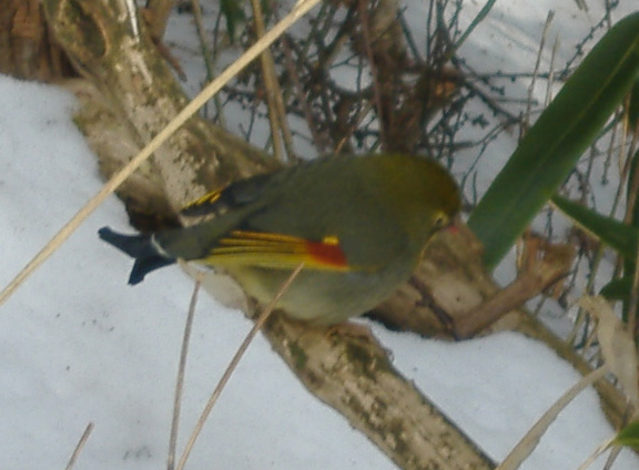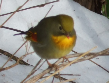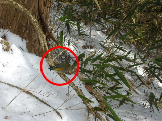 | のんびり休憩し、一緒に歩き出すと小鳥が・・ (写真は全て同じ一羽の鳥です) メジロかと思ったこの鳥はソウシチョウ(相思鳥)というようです(heppoco隊長さんより)。外来種で原産は中国。名の由来はペアの仲が良いことからなのだそうです。縁起のいい鳥に出会いましたね、サイテイのみなさん、そして委員長さん(^_-)-☆ 別名かご抜け鳥ともいい、観賞用の鳥が野生化したものだからとか。かごから抜け出して自由奔放に飛び回る・・・まさにサイテイにピッタリではありませんか(爆) 気に入りました♪ |