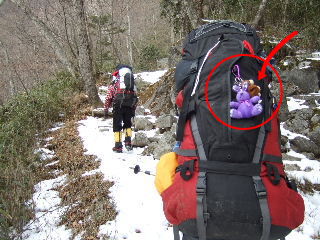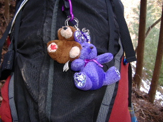 | どうも気になるようで、heppoco隊長さんが たくさん写してくれてました(笑) どちらもカズさんからいただいたマスコットです。 クマさん(蓼科山で)と、うさぎさん(今日)♪ 小太り親方さんからは 「sanaeさんのデカザックの上は『山の縫いぐるみ動物園』・・・」と!(笑) |