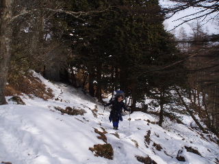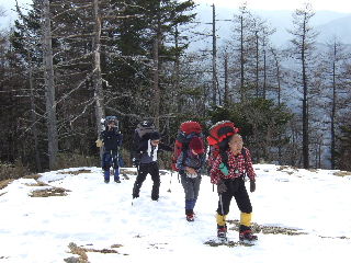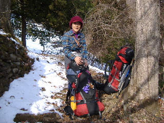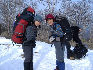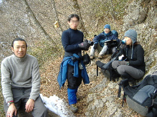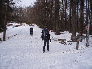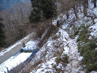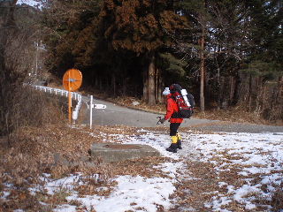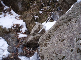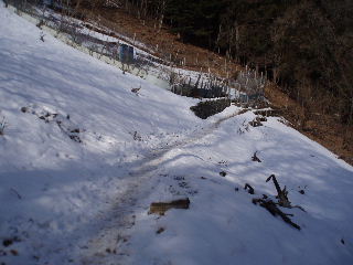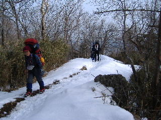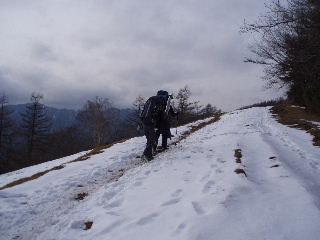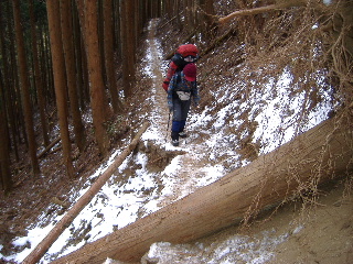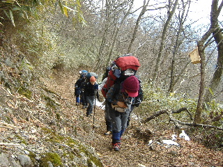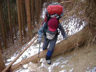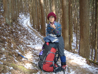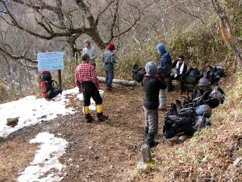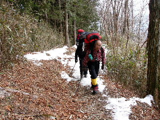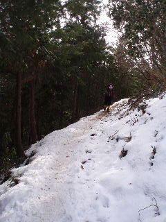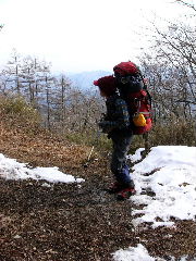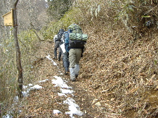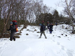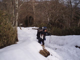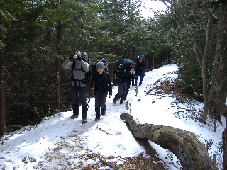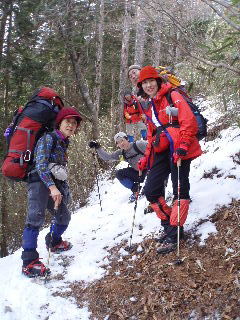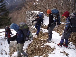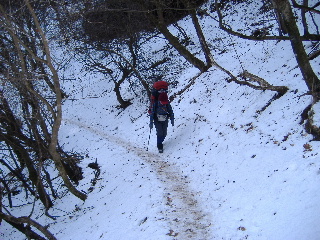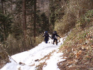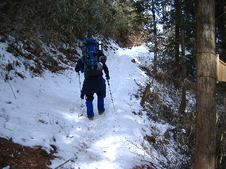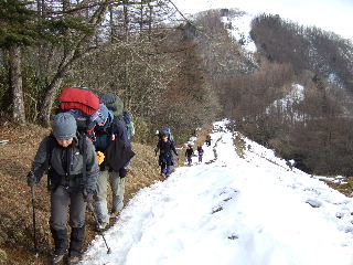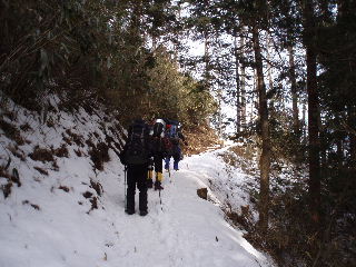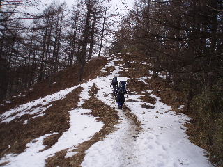 | 登山道は所々アイスバーンです。重荷ですからバランスを崩したら大変!アイスバーンではどうしても超スローペースになります。 最初の休憩時、早めにアイゼン(6爪軽アイゼン)をつけました。とはいえ雪のないところもありますから、この辺りからつける人は殆どいません。でも安心・安全が一番! |