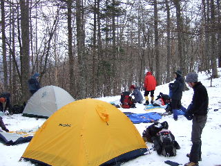 | 委員長とheppoco隊長さん?が代表でテント場代(一人400円)を払いに行きながら小屋休憩(一人300円)もお願いしてきてくれました。 みんな揃ったところでテント設営。 |