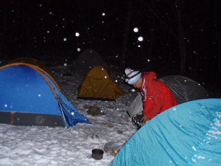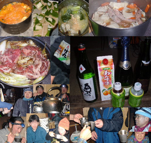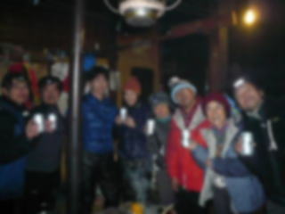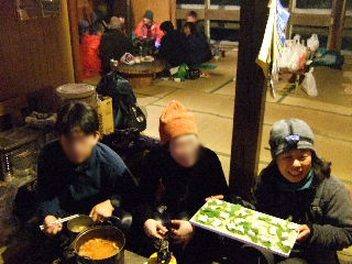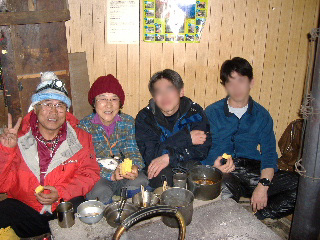 | テント場に戻り、食材と水を持って奥多摩小屋へ。小屋には他に、heppocoさんのお知り合いのijiruさんのグループだけ?でした。みなさん良い人で、和気藹々と良かったですね。 私たちはストーブの周りを拝借、ラッキーでした♪ |