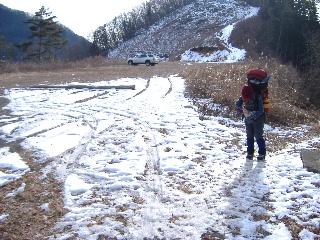 | 【※ 写真は一部みなさんの写したものを勝手に拝借しています(^^ゞ。殆ど記名していません^_^; 事後報告ですがご容赦のほど。⇒ メンバーALL】 【※ コースタイムは先発、後発いろいろですが、ここではsanae隊のタイム。ただし、不明部分多し・・ご容赦ください^_^;】 奥多摩JOY!楽しみにしていた我らでしたが、間際になってトシちゃん、膝の具合が良くないと言い出しました。みなさんと一緒に歩きたかったのですが、タダでさえ亀足・・・先に出発させて貰うことにします(T_T) 電車か車か迷ったのですが、テント泊装備で自宅から最寄り駅までの移動が大変なため、今回も車に決定。前夜発で鴨沢まで向かいます。 駐車スペースは10台くらいでしょうか。小袖乗越まで行けば広場がありますが、天気が崩れれば積雪の心配があり、坂道は危険と判断、この鴨沢バス停側の駐車場にしました。 |