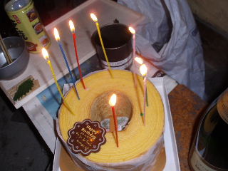 | そして¥さんがおおきなバームクーヘンを持ってきてくれました\(^o^)/ なんと! 1月、2月生まれの人のBirthday祝いですって!みんなでHappy Birthday♪を合唱(小屋で歌うってすごいなぁ〜笑) |