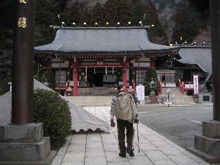 小さい子供連れの家族や若いカップルが登っているくらいの静かなコースだった。早朝は混んだのかもしれない。 下社もまた閑散としていた。翌日は登山マラソンが行われるそうで大きな横断幕が張られていた。私などは普通のマラソンさえ苦しいのに・・・。苦しさ2倍どころか2乗だよ・・と思ってしまう。すごいなぁ・・(@.@) 境内のはずれで小休止し、再び歩き出そうとしたら年配のグループが下りてきた。平均すると70代ではないだろうかと推察しつつ、元気に歩かれる皆さんにあやかりたいものだと夫と話した。 |