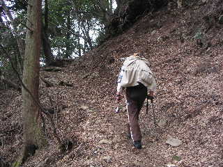 下社からしばらくは階段の無い歩きやすい登山道だった。よかったねぇと喜んでのんびりと登っていく。途中下山してくる人に数名すれ違っただけの静かなコースだった。時間が遅かったせいもあるだろうが、大山にしては珍しい。大勢に歩かれているという証拠に登山道は沢のように窪んでいる。石で階段が作られているところもやはり出てくる。大山は信仰の山で古くから登られているのだから無理も無い。 |