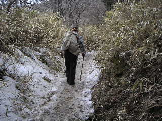山頂からの展望は少し霞んでいた。空はやや曇り空になり、気温は10度ほど。下るころには4度・・かなり冷えてきていた。 テルモスの温かいお茶を飲みながら遅い昼食を食べていると、途中で会った若い三人(甥、姪と叔父だそうだ)も登ってきた。時間を聞かれたのをきっかけに何かと話しかける夫(おせっかいうるさかったでしょう?ごめんなさいね^^;;)。 ヤビツ発のバス時間に充分間に合うのを確かめ、頃合をみて下山。山頂直下は雪で滑りやすいのでストックを出し、注意して下りていった。 |