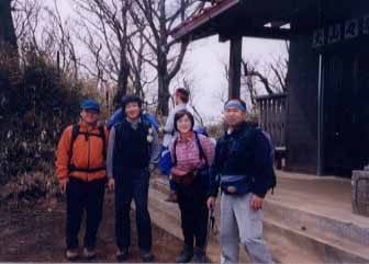 ミニオフ!花は咲いたか桜はまだかいな♪H13年4月8日(日) 天気;曇り一時晴れ Member.2人(山頂集合、計4名) 【コ ー ス 】 ヤビツ峠7:10〜(途中道を通過してしまいタイムロス20-30分)〜登山口8:30〜16号鉄塔手前の分岐9:30〜大山山頂直下の広場11:00-13:30〜大山山頂13:40-50〜ヤビツ峠14:40 【大山山頂で】右 GW前の足慣らしにどこか歩こうかと思っていたところへ、teihaiMLのテラさんからオフミの呼びかけがあった。別の予定もあったが兵庫からの精鋭、だめちゃん(@幕張)とのご対面もまだ済んでいないことだし、今度こそ行かなければと万障繰り合わせて夫婦で参加した。 前日の土曜日は急遽孫のお守りとなったが、帰宅して夕食をすませた後、出発。前夜発は久しぶり。丹沢で前夜発というのも珍しいが、今回はヤビツ峠の駐車場がいっぱいになる前に入っておきたかった。山頂に12時集合ということで、コースは各自の選択。私たちは足慣らしを兼ね、静かな北尾根を行くことにする。 1時間の余裕をみて、朝7時過ぎに駐車場奥の入り口から沢づたいのコースへと進む。ここも結構歩かれているようだ。青山荘のある門戸口からは林道を北上。アブラチャンやミツマタの花が結構咲いていて楽しませてくれた。ミズヒ沢を渡ってすぐ登山道にとりつくはずだったが、夫は林道だと言った所を私が空き地と勘違いして通過してしまった。札掛の建物を見てあわてて引き返し20-30分のタイムロス。不機嫌になる夫をしり目に、道を間違えたからミツマタの群落や可愛い桜も見ることが出来たねと気持ちをそらす。すると「歩く練習だからな・・」と夫も前向きな発言!ほっ! よく見ないと登山口とは気づかないが、踏み込めばしっかりした登山道が続いている。右に沢を見ながら斜面を登っていくが、立派な林道が沢づたいにのびているのが見える。先では工事をしているらしい音が響いていた。尾根にとりつき、檜や杉の樹林を抜けるとまだ葉のない落葉樹林となって、とたんに明るく感じられた。天気は曇りがちで、木の間からの眺めはイマイチだが、この時期ならではの快適空間。もう少し先には新緑、そして秋には紅葉が楽しめる良いコースに違いない。 一ノ沢峠への分岐へ出てようやく見覚えのある風景となった。ここは昨年の2月に逆コースでヤビツから大山、一ノ沢峠、物見峠、煤ヶ谷へと歩いている。あの頃で、無いと思った雪があって驚いたが、今回も山頂直下に少しだったが雪がまだ残っていて驚いた。さすがに今年は雪が多かったというのが頷ける。 西沢の頭あたりで休憩した後、歩いていくと下ってくる数名の声。静かだった山行に初めて人と会った。そしてその後単独の男性とすれ違ったが、後日のメールからどうやらHMLの河野@横浜さんらしいと思われる。登りで出会ったのはこの2組だけだった。 11時には無線交信の予定だったので、出そうかと思った頃、待ち合わせ場所に着いてしまった。既に男性一人・・「寺田さんですか?」と声をかける。H11年の10/10に鳥海山で遭遇して以来の再会だがどうも自信がない。寺田さんとわかってホッとした。と、既に用意されていたテラさんの無線機に声が入った。だめちゃんだった。既に山頂に到着とのこと。12時集合なのに意外にもみな1時間前には到着してしまったわけだ。凄い。集合場所には三百名山達成の記念碑があった。テラさんの同僚の方のだそうだ。なぜこの山の、その場所にしたのだろう?聞くのを忘れてしまったが、ちょっと意外な気がした。