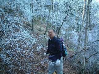 3回目、又分岐だが、直進はススキが繁っていたので道なりに右へとカーブした(下山の時は、このススキの方の道を下りてきた)。なおも林道は続くが途中から不鮮明な登山道になってしまった。男山は目の前だ。急に「あれは何だ?」と、夫の声。まるで満開の桜のように、山頂周辺は真っ白になっていた。霧氷だ。昨夜の雨が今日は気温が急激に下がったために、見事な霧氷となっていた。素晴らしい眺めだった。それにしても、どこをどう行けばよいか分からない。さっきの分岐を右へ行けばよかったのか?しばらくは尾根と尾根の間を行ってみた。その後、ともかく左側のとりつきやすい尾根の方に登ってみる。尾根はいくらか歩きやすい。雑木林の樹林帯は既に落葉し、カサコソと踏みしめながら進む。これが登山道となっているものか確信は持てなかった。