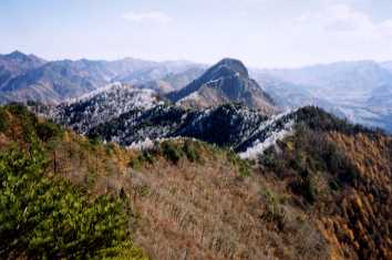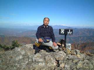 山頂にはだれもいなかった。そして360度の大パノラマに一瞬声も出ない。一呼吸おいて、感激の声。素晴らしい。西に八ヶ岳の全景。昨日とはうって変わってその山頂は雪景色になっている。南に向かって南アルプス、そして大きな富士山、その側に瑞牆山、金峰山が分かりやすい。甲武信岳、雲取山だろう、奥多摩への山並みが続いている。東は天狗山、御座山の向こうに秩父の山々、その北に荒船、妙義など上州の山、真北に浅間山があった。浅間山が一番白くなっているように見えた。昨日の茂来山も展望は良かったが、この男山からの展望はさらに素晴らしい。北の山々は雪で白く、南と東の山々は霧氷(おそらく)で輝いている。裾野はぐるりと黄金色だ。この辺りは落葉松が多いのだろうか、おしなべて黄金色に統一されている。そのおかげで山の形が浮き上がってとてもきれいだ。まるで立体地図の模型を見ているようだった。