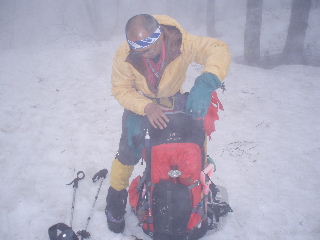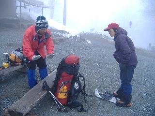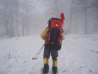 | 歩き始めようとしてトシちゃんの足が止まりました。赤布の竹を忘れ、もう一度車の所まで取りに戻りました。こんなガスガスの天気ですし、4日間ですから安心のため持っていくことにします。 | ||||