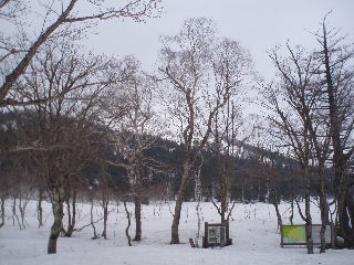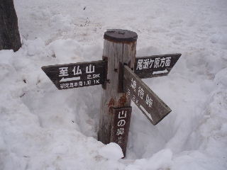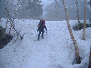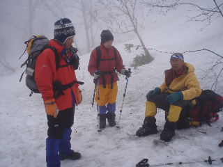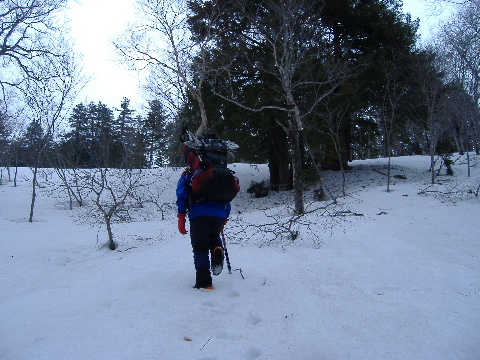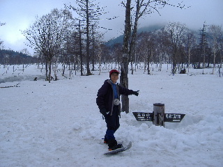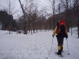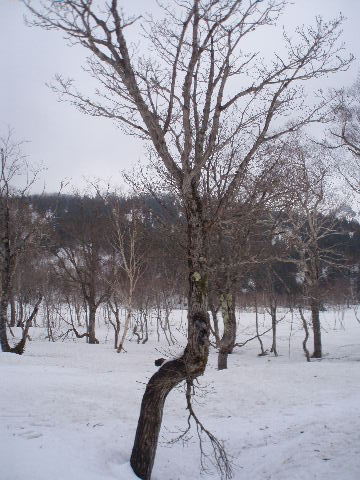 | GPSの事など話は尽きませんが、私達は登山口でスノーシューを履き山の鼻へ。カズさんたちは鳩待峠から登って山の鼻へ下り、鳩待峠に戻るそうです。私達はお天気次第で山の鼻にテントかな・・・なんて笑っていたのですが、その先に進むことができ、カズさんとは結局ここでお別れでした。 | ||||