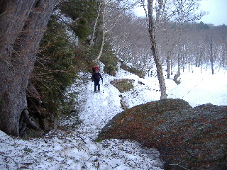 | この日山の鼻へ向かう人はほんの数グループでした。 山の鼻へ最後の橋を渡る時、山スキーの人がストックを片方無くしたといって捜してました。川に落としてしまったものか、お気の毒に思いましたが、ストックが無くても滑れるそうでした。 |
