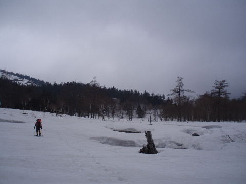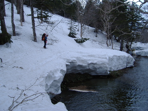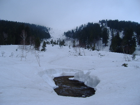 猫又川やら湿原の上は急速に雪解けが 始まっています。 |