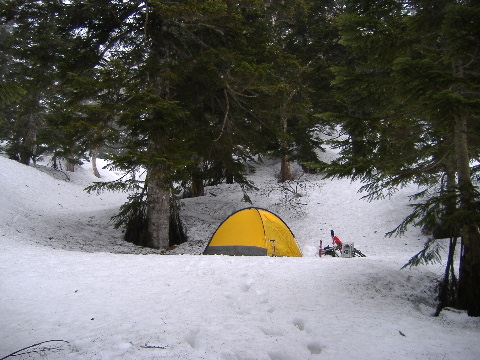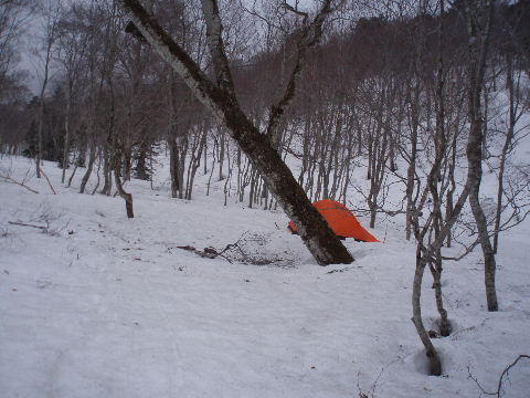 | ススヶ峰の稜線に出るよりは沢沿いから 稜線の分岐へと目指すことにしました。 先の山スキーの男性もそのようでしたが 私達はタイムオーバー、途中1700m辺りで テントを張ることに! |