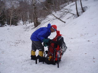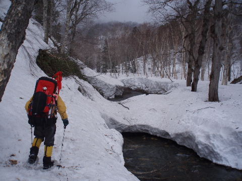雪解けが進み、山側にトラバースしたり、 怖々川の上の雪上を渡ったり・・ 緊張するところがいくつかあります。 |