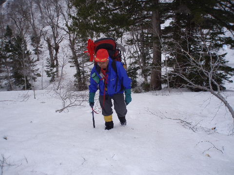最初は急登に思えたので、ツボ足でピッケルにします。 |