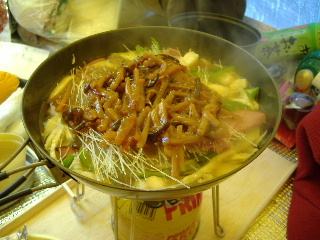 | メニューはチャプチェ(春雨の中華) つまみ、ジャコサラダ、パン・・・ |