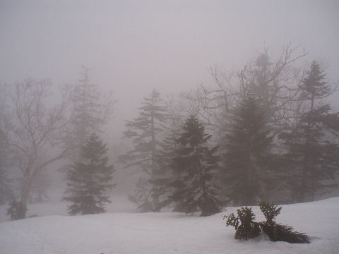 4時過ぎに起きるとまたしてもこの濃霧 すっきり爽やかな朝日を眺めることは ついにかないませんでした。 気温はマイナス4.4度 でも天気予報はこの日も晴れのはず^_^; 今日は最終日。今日こそ早めに出て のんびり歩こうと思っていたのですが またしてもお天気次第の出発時間となります。 |