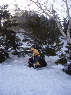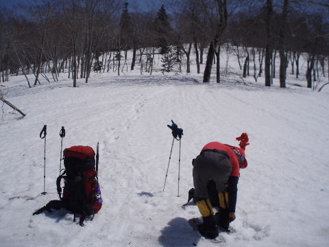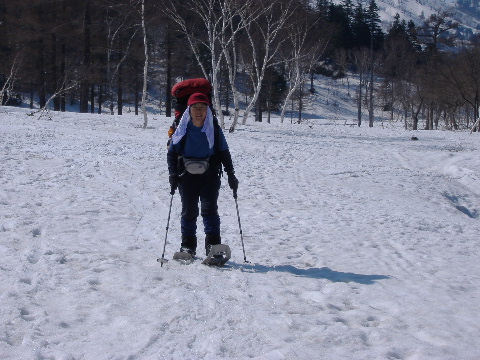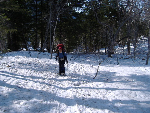 スノーシューを脱いでツボ足で下ります。 |