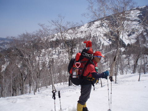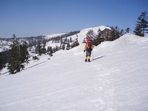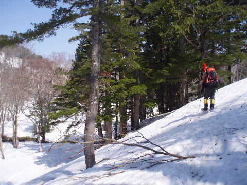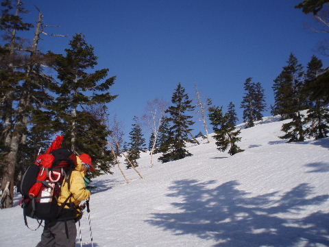 鞍部からトラバース気味に稜線を目指します。 気持ちのいい青空が広がってます。 |