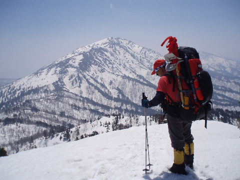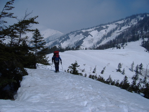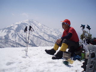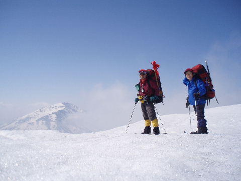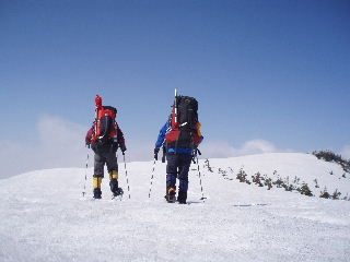 | sanaeは景鶴山、平ヶ岳と登って、もう充分満足しました。なので、登ってきたルートをそのまま下ろうと提案します。ところがトシちゃんはあの、いつ崩れるか分からない猫又川や湿原の雪上をできるだけ歩きたくないから予定通りススヶ峰の稜線を行こうと言います。お互いに「らしくない」発言で笑ってしまいました。 | ||||