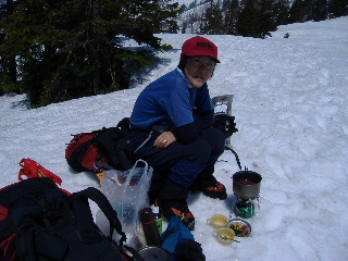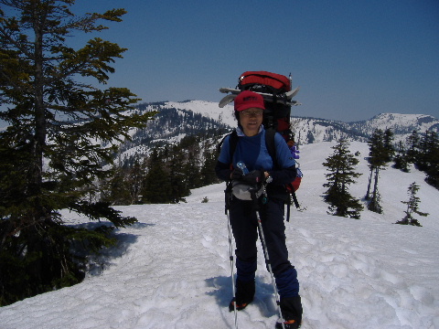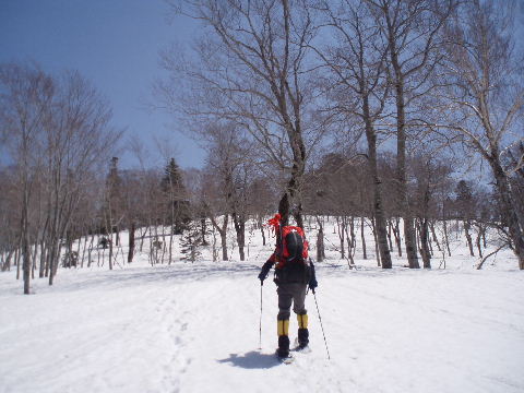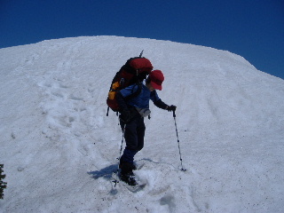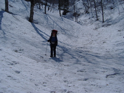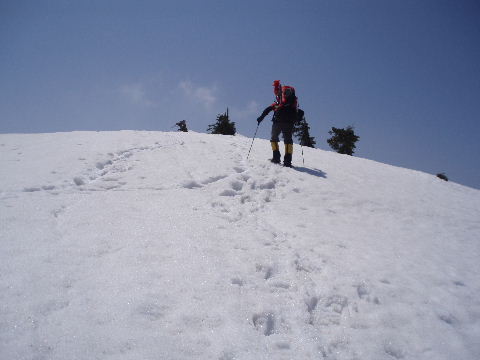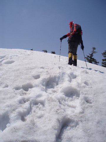 ザラメ状の下りはツボ足の方が 歩き易いですが、すぐ登りになるので そのまま下ってしまいます。 |