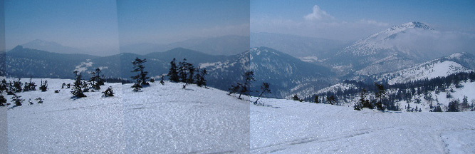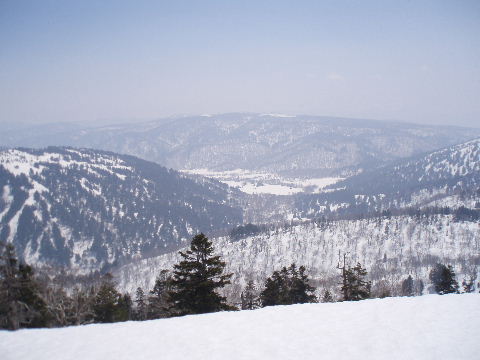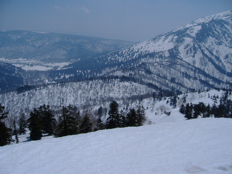 振り返れば、 今日歩いてきた大白沢山麓からススヶ峰、岳ヶ倉山など一望です。 (出発日はガスでみえませんでした) |