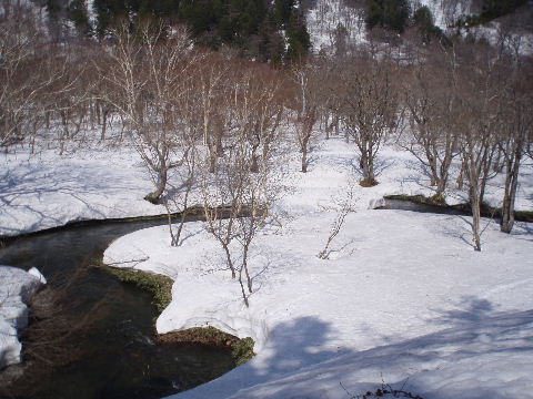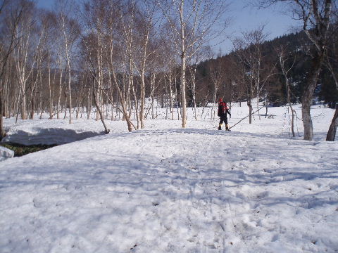 雪解けのスポットに落ちないよう 気をつけて進みます。 |