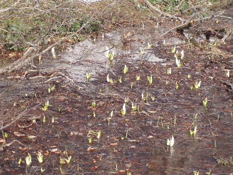 山の鼻で少し休んで鳩待峠へ。 ミズバショウ 4日間で咲きかけてきています。 |