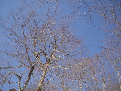 途中でスノーシューを外しました。 一休み、一休み・・・^_^; 見上げると青空がとてもきれい・・・ 疲れた体に元気注入〜〜〜 |