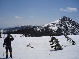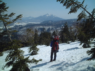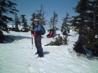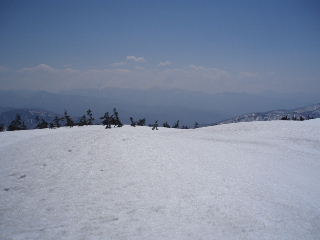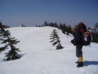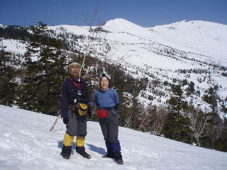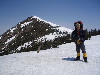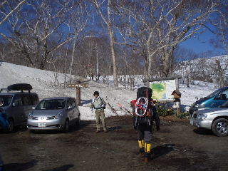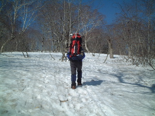 | 多くの人は日帰りの軽装備でした。我らは「いったいどこへ行くんだよ〜」みたいな重装備です。ストックはもとより、ピッケル・アイゼン(12爪)・わかん・スコップ・スノーソーまで持ってきていますから^_^; スキーの人も多かったです。たまたま岩手山で凍死の遭難事故があったばかりでしたから、途中で写真を撮ってもらったスキーの単独男性は、ツエルトを持ってきたと話していました。後から知ったことですが、この翌日には我らの通った悪沢岳で山スキーの男性が道迷いで救助されたと聞きました。とても良い天気だったのですが・・ |