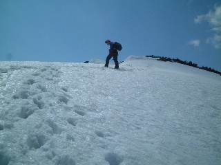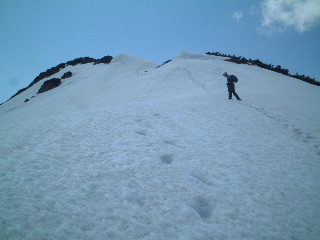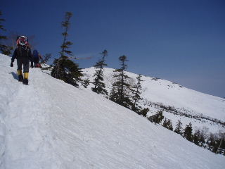 | 再び歩き出します。白い雪と青い空のコントラストが素敵です。登りの苦しさなんて不思議と感じませんでした。 | |