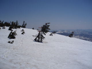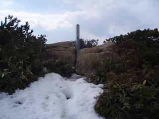 | 山頂の手前でハイ松帯の中を通りました。踏み抜いてちょっと登りにくいところがありましたが無事登頂です\(^o^)/ | |