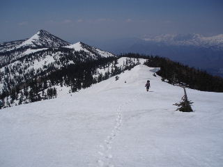 | ここで前方から先行者が戻ってくるのが見えました。年配の単独男性でした。すれ違う時山頂の様子などをお聞きします。コチラがテント装備だったので「湯の小屋に抜けるんですか?」とすぐきかれましたので、このあたりに詳しい人のようです。 湯の小屋に抜けるコースは以前山仲間と行く予定だったのですが、なぜだったか計画倒れになっています。 |