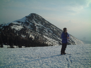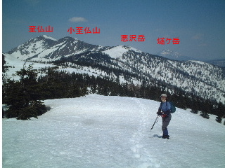 | 笠ヶ岳に行く前に小至仏山をバックに。西斜面は雪がかなり落ちています。 | |