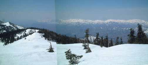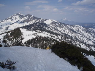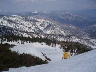 | 眼下にテント場です。その向こうの山並みは坤六峠から笠ヶ岳に伸びている尾根。さきほど山頂で出会った三人が歩いてきたルート。山スキーを途中でデポしてきたとか。こちらはなだらかで歩きやすいそうです。 | |