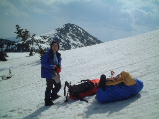 | 今回、湯の小屋温泉には行かず、翌日は戻って至仏に行きます。雪洞かテント泊にするので、とりあえず小笠の直下にザックをデポ。 ピッケルをもって笠ヶ岳に向かうことにします。 |
