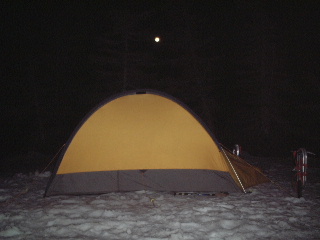 | 夕焼けを待たずに眠りに就いてしまいました。 トシちゃんが夜中(といっても9時ごろ)起きた時の風景、月夜の中のテントです。 トシちゃんの雄叫びが響いたでしょうか? 誰も居ないからいっか!(笑) 翌日へ |