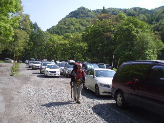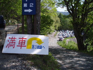 | 前夜10時半過ぎに自宅を出発。大清水登山口に2時過ぎ到着。登山口脇の第2駐車場へ。収容台数240台。着いた時はガラガラでした。 6時に起きられず結局7時過ぎに起床。既に駐車場はいっぱい。このとき隣りの車の主がまさか・・・・ 朝食をとりながら準備。駐車料金500円を支払って出発(二日目以降は無料)。 |