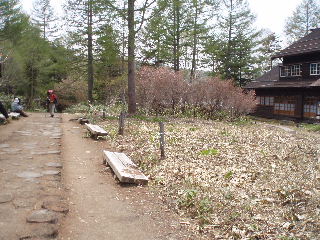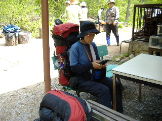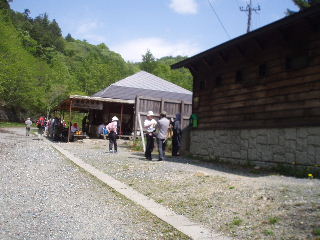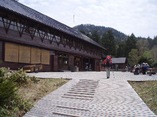 | 一ノ瀬の休憩所。ここにもきれいなトイレがあります。ペーパーつき水洗。尾瀬はどこもトイレ維持協力金100円を支払います。 1時間ほど歩いてきたので私たちも少し休憩。 |