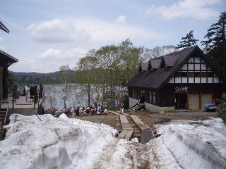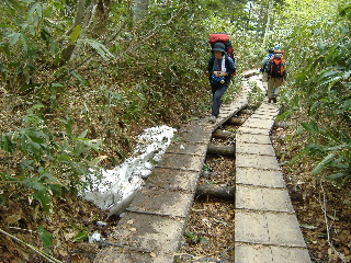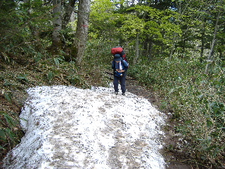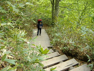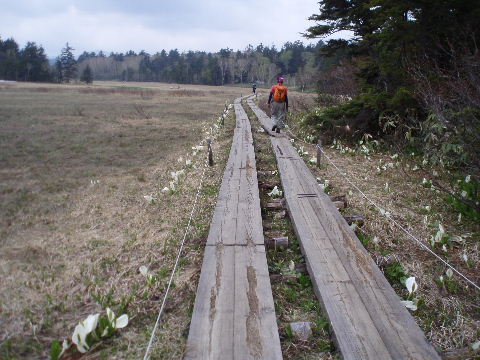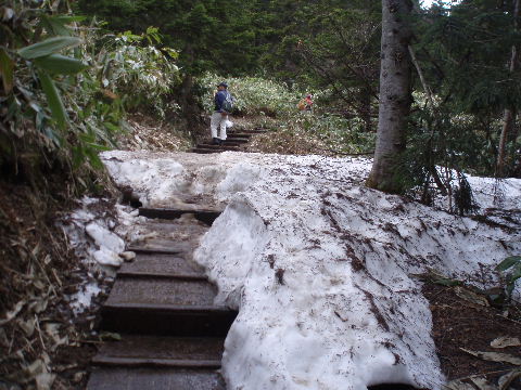 沼山峠への登りでもまだ残雪が所々に。 こちらは短時間で尾瀬沼に入れるので 年配の方や目の不自由な方も歩かれていました。 |